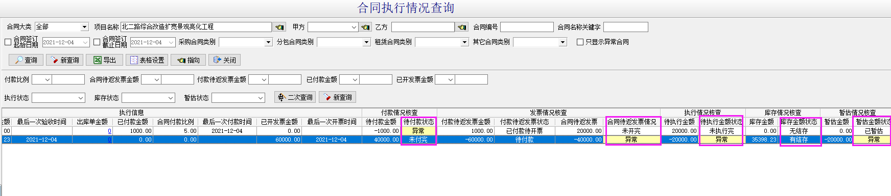 付款情況核查:待付款金額大于0;顯示“未付完;”;等于0,顯示“已付完;待付款小于0顯示“異常”,標注“黃色”
