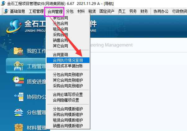 “采購合同”、“分包合同”、“租賃合同”、“其他合同”等查詢項,過去這些查詢項只能單獨查詢各自所對應的 材料、分包、租賃、其他費,不能提供系統(tǒng)的匯總數(shù)值查詢,鑒于此,金石工程項目管理軟件新版本中新增 “合同執(zhí)行情況查詢”用于對下游合同的綜合匯總查詢。