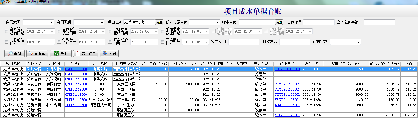 項目成本單據臺賬是用來查詢有合同(采購合同、分包合同、租賃合同、其它合同)或者無合同的驗收單(材料采購單、設備采購單;分包人工;外包機械單、租賃結算單、運輸車輛單;其它費用單;設備維修單)、付款單、發票單。