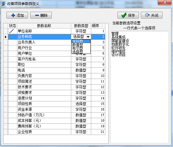 ①點(diǎn)“添加”按鍵增加豎列; ②在“參數(shù)名稱”列輸入需要的內(nèi)容; ③“參數(shù)類型”列選擇類型,其中“字符型”可輸入文字和數(shù)值、 “選擇型”可以如下圖中顯示一行代表一個(gè)選擇項(xiàng),只可選擇不能輸入 、“數(shù)值型”只能輸入數(shù)值,不能輸入文字內(nèi)容 、 “布爾型”則是勾選選擇型; ④“順序”列調(diào)整自定義項(xiàng)的先后排序 。