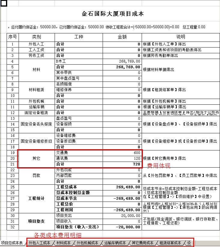 彈出項目成本利潤表,可以查看該項目的其他費用項目,是否有顯示之前錄入的費用。其他的類別隨著工程的進度中,錄入相應的單據,會產生其對應的成本費用。