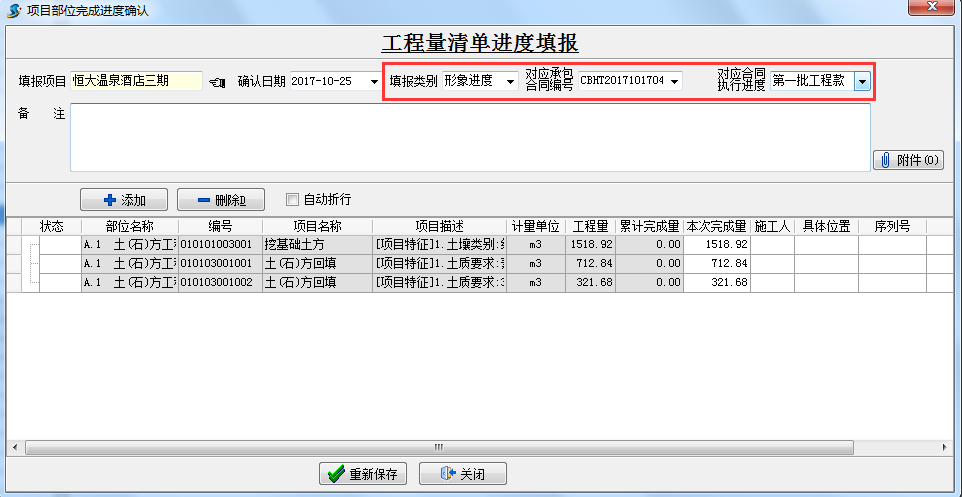 根據工程量清單填寫形象進度(形象進度為與甲方結算的依據),對應“承包合同”和“合同執行進度”