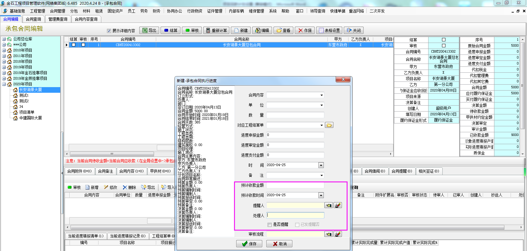 1、在【工程管理】-【承包合同】-合同執(zhí)行進(jìn)度,點(diǎn)擊新增,填寫預(yù)計(jì)收款金額、預(yù)計(jì)收款時(shí)間、提醒人、是否提醒。