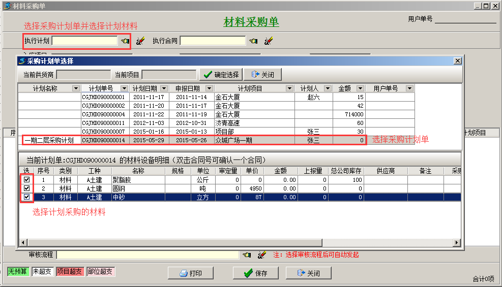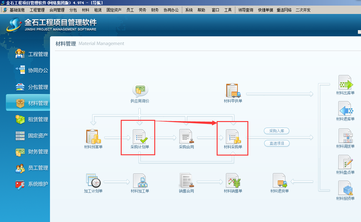 項(xiàng)目在工程項(xiàng)目管理軟件上報(bào)采購(gòu)計(jì)劃,相關(guān)人員逐級(jí)審批通過,然后辦理采購(gòu),驗(yàn)收入庫(kù)。(這種情況適合項(xiàng)目上大材批量采購(gòu),不需要簽訂供貨合同)。