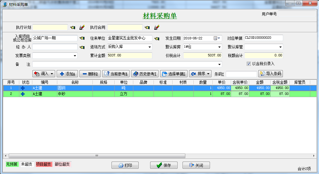材料調(diào)入到材料采購(gòu)單中之后,執(zhí)行材料采購(gòu)。具體執(zhí)行流程參照第一種情況,如圖: