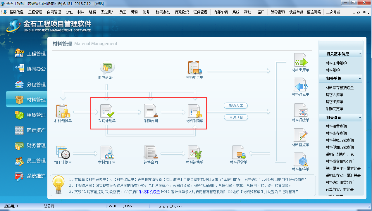 第一步,進入工程項目管理系統的【材料管理】模塊,點擊[采購合同],如圖: