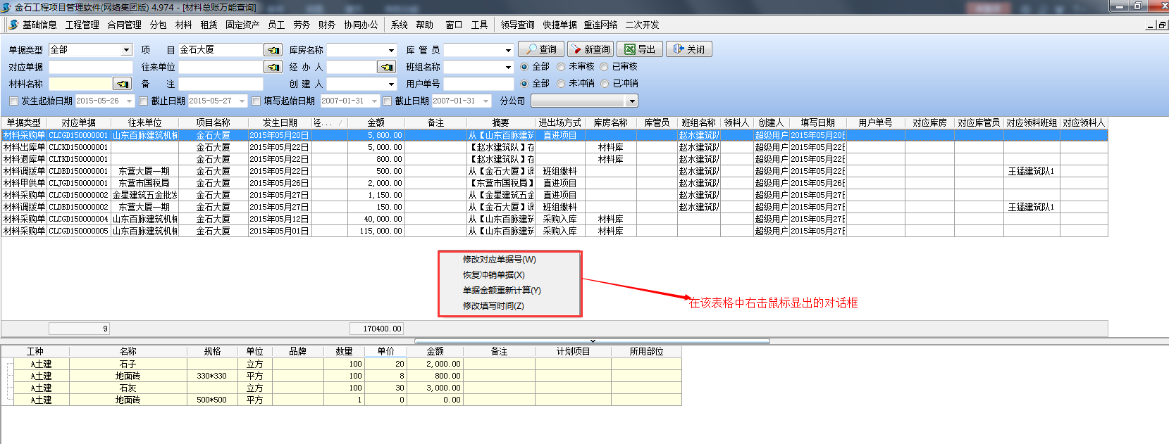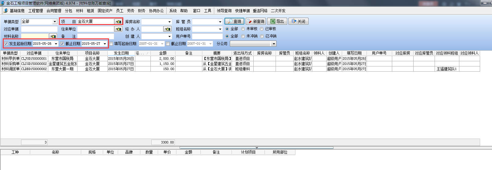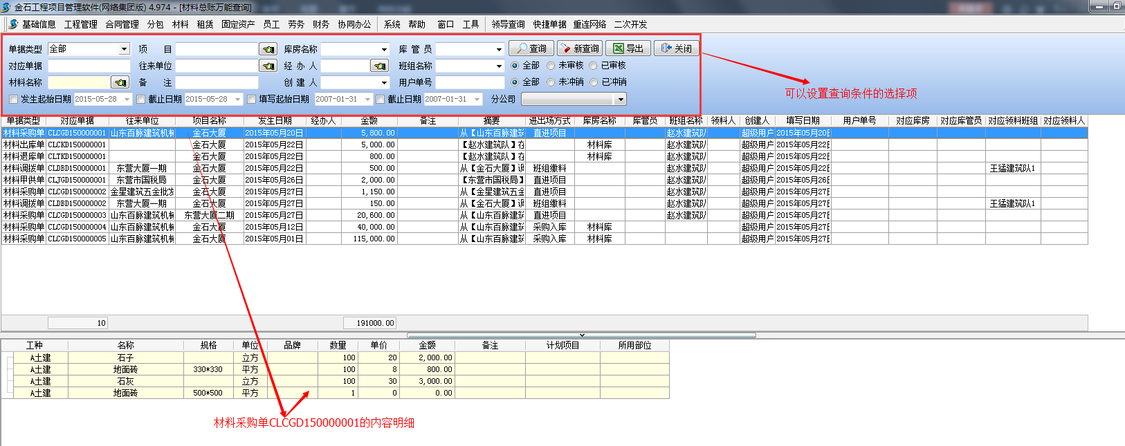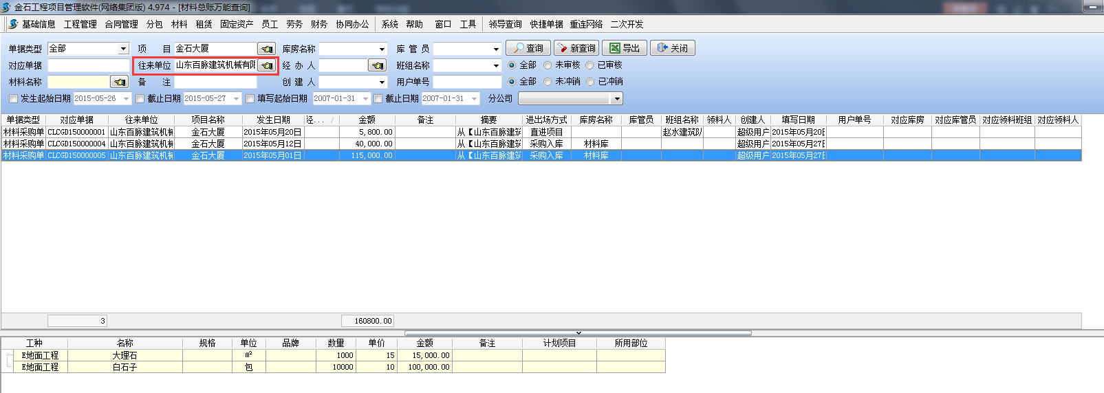 如下圖:查詢項目【金石大廈】所有材料采購單的歷史明細。