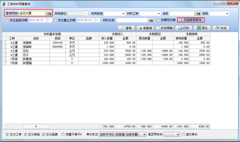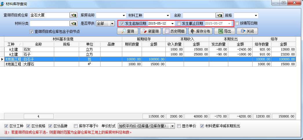 設置查詢項目為【金石大廈】,查詢結果如下圖:查詢當前項目【金石大樓】(包括所有庫房)的材料庫存情況。