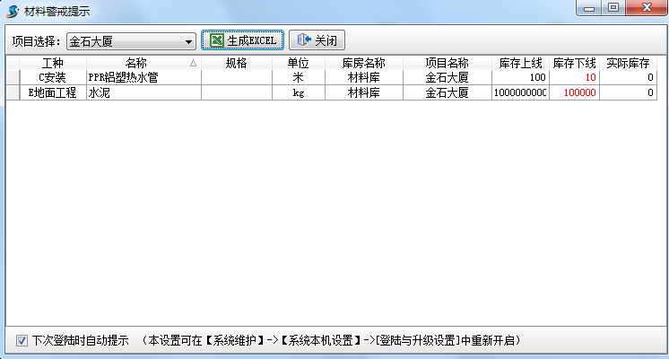 工程項目管理系統中我們也可以設置登錄軟件時自動提示庫存警戒。設置好之后當材料的庫存量達到了預警設置中設置的上限或者下限,登錄時會自動彈出提示。