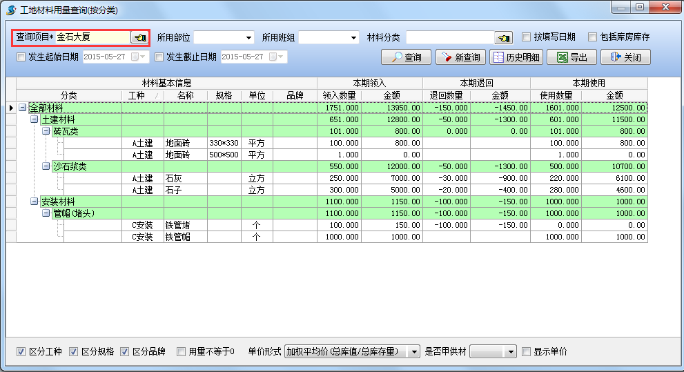 工程項目管理系統中【工地材料用量查詢(按分類)是按材料分類分類查詢工地材料用量,在查詢前需要設置查詢項目。
