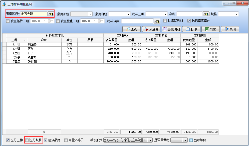 取消過濾選項"區分規格",查詢結果如下圖:相同材料不同規格的材料用量將匯總在一起。