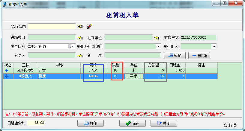 按件數計算的租賃材料,調用時系統會自動換算成平米、平方米、m2、M2等計費單位。如上圖