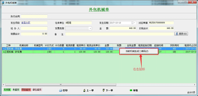 1、在最新版的金石工程項目管理軟件6.0中,外包機械單有一個更新,就是添加了二維碼打印的功能,如下圖