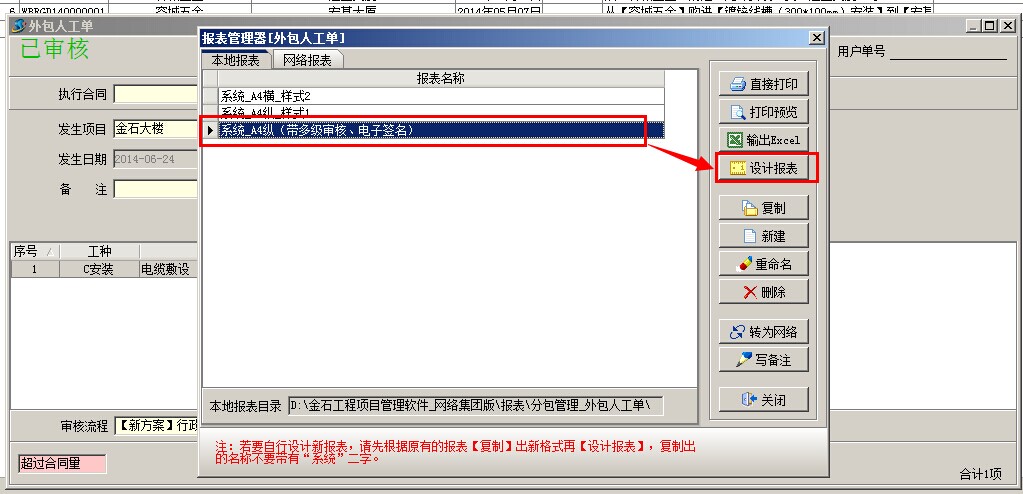以下圖的外包人工單為例說明,點擊打印,選擇帶電子簽名的報表,點設計報表