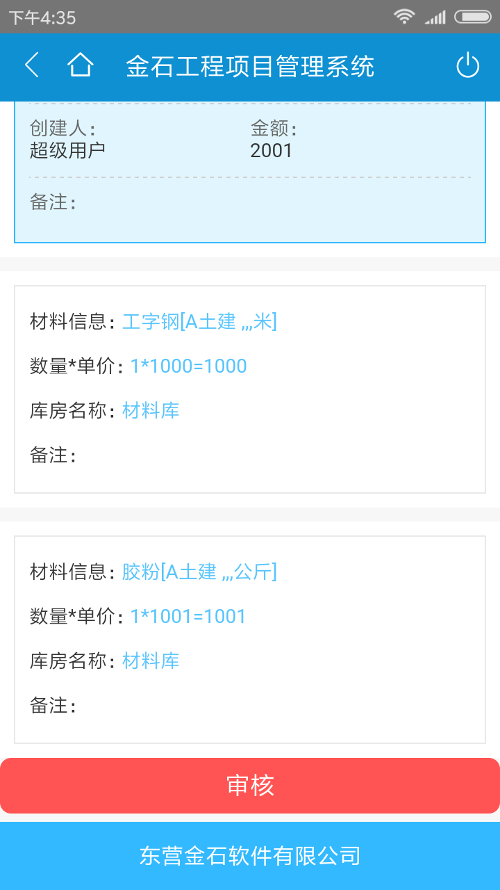 2.金石工程管理軟件手機(jī)端的操作,在配置好企業(yè)微信的前提下,進(jìn)入手機(jī)端的單據(jù)填寫并打開審核中心,如圖所示 點紅色的審核鍵進(jìn)入“簽名區(qū)域”輸入審核人→輸出簽名→提交