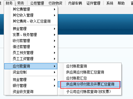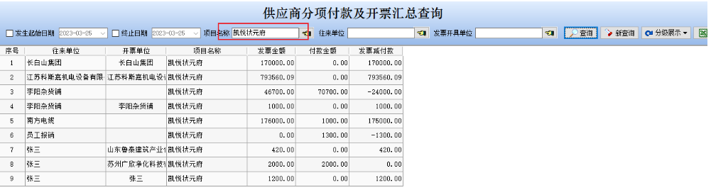 在此窗口中我們可以看到,同一項目名稱、不同往來單位,不同開票單位對應的采購金額、發票金額、發票金額和發票減付款金額。