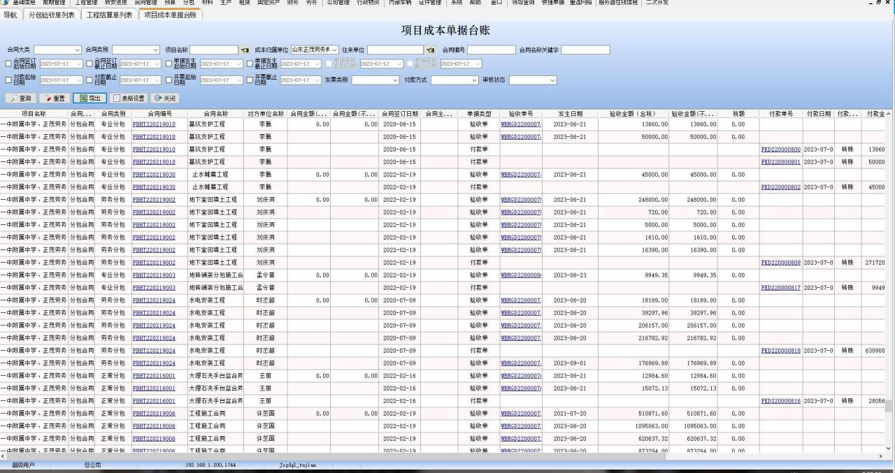 1、項目成本單據臺賬表金額類字段增加腳標匯總。