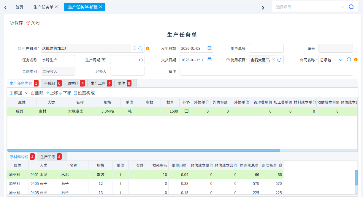 財筑云工程項目管理平臺生產管理是專門針對有生產過程的施工企業研發的模塊,例如機電安裝、市政路橋等行業。可以管理從下達生產任務到生產領料加工、生產入庫等流程。