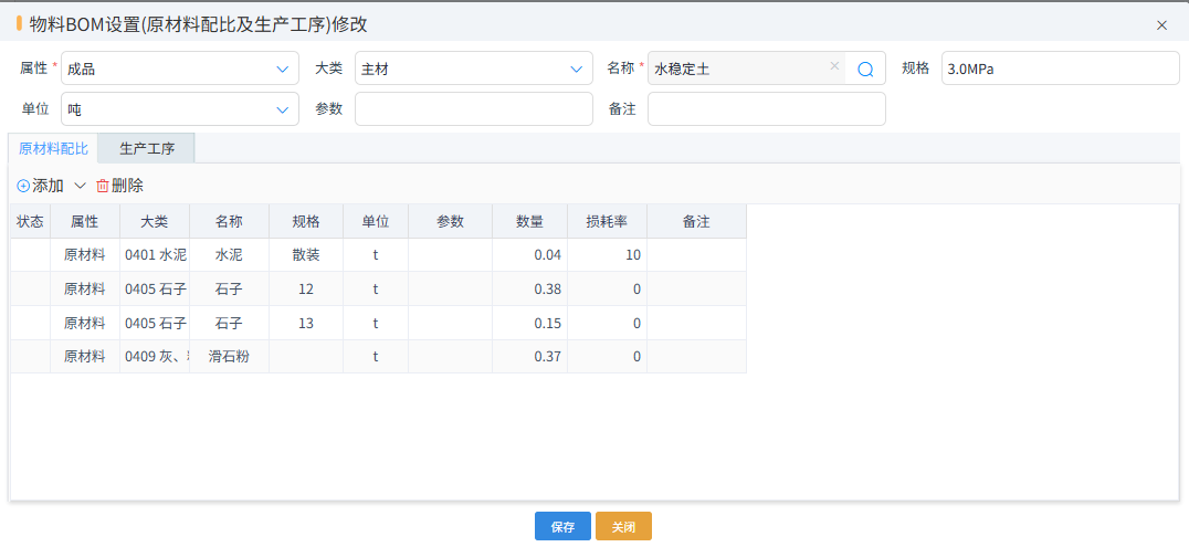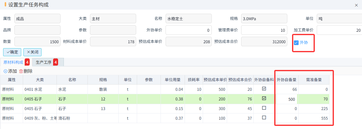 選擇需生產的材料后可以點擊設置構成,再次調整物料BOM。在原材料構成這里可以設置預估成本單價和查看原材料需求總量。