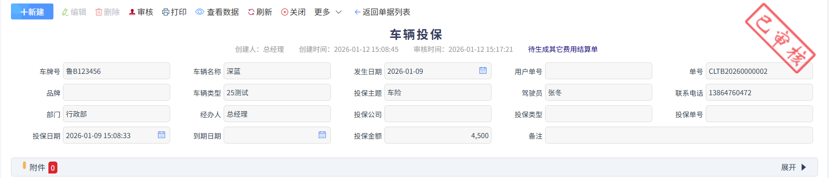 投保金額為車險金額,審核完后,點擊更多下的生成其它費用結算單走付款申請流程,一般公司的車對公支付車險,不走報銷流程,如下圖所示