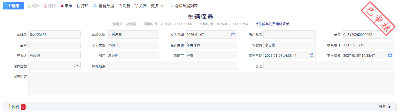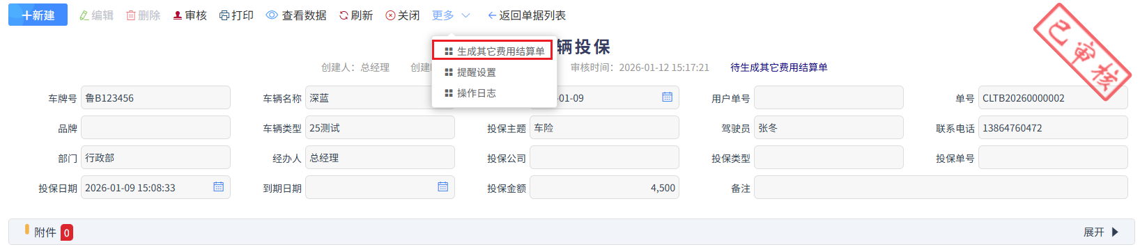 車輛保養的相關費用,輸入保養金額中,審核完成后,點擊更多中的生成其它費用結算單進入進入報銷流程,如下圖所示