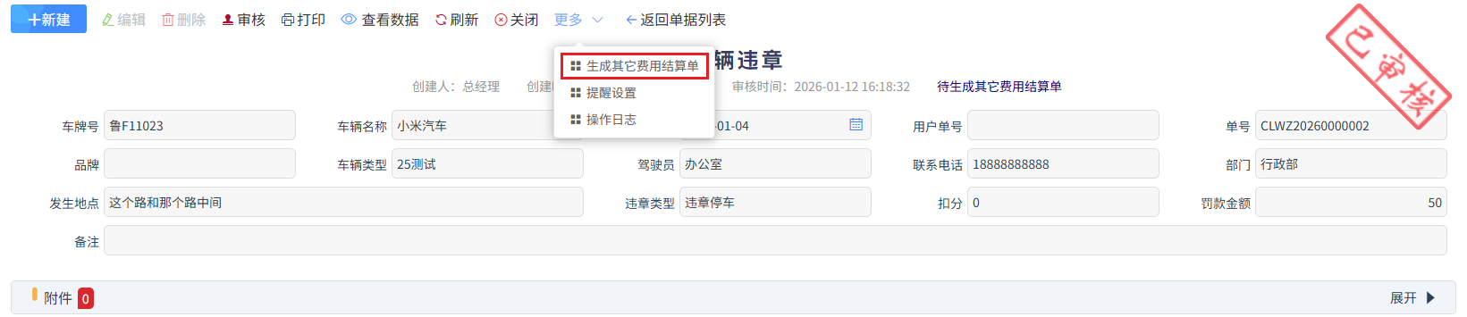 罰款金額為違章罰款金額,審核完成后,更多中生成其它費用結算單,走報銷流程。如下圖所示