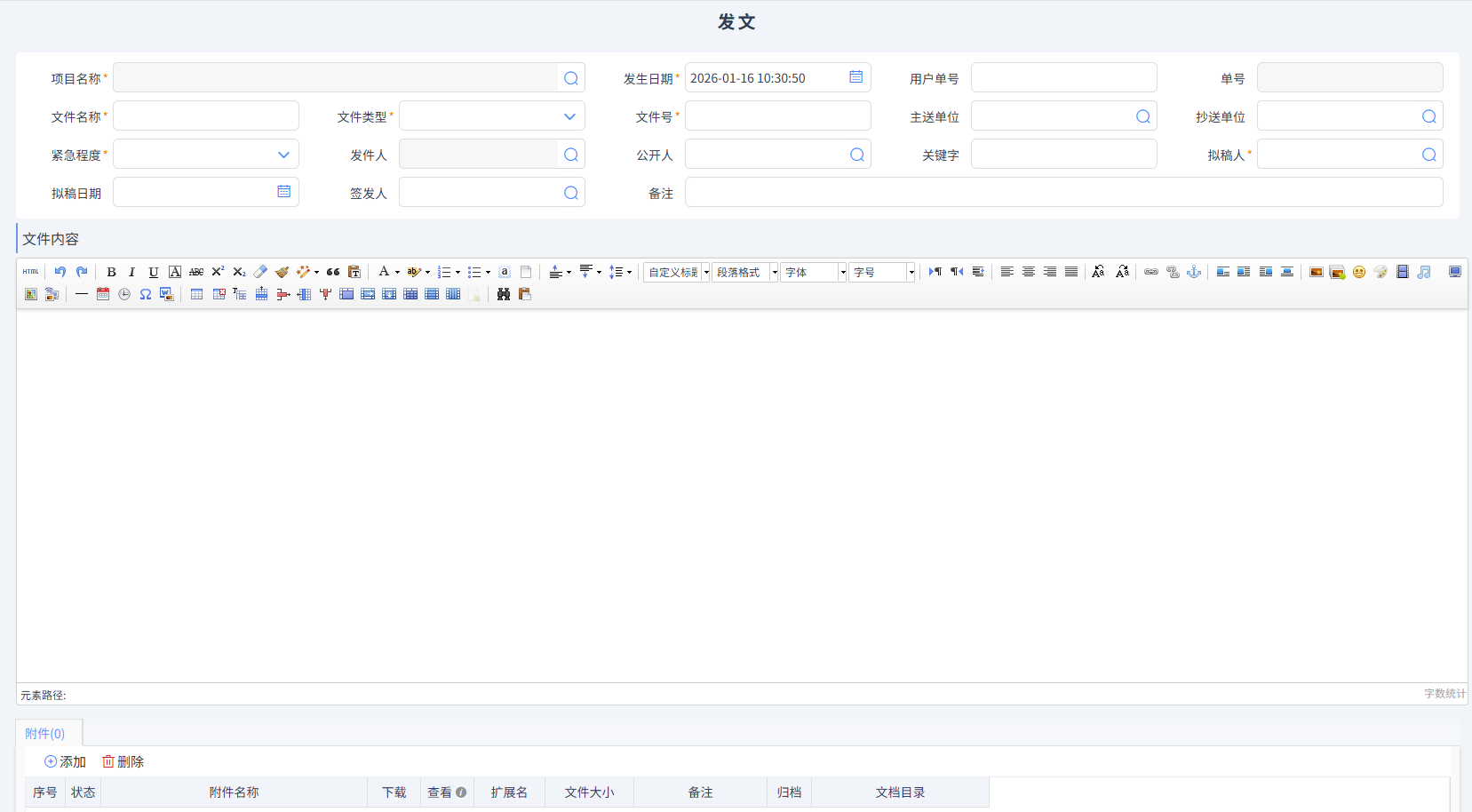 和收文類似,根據發文要求填寫文件名稱、文件類型、主送單位、擬稿人等,并附上發文電子檔,如下圖所示
