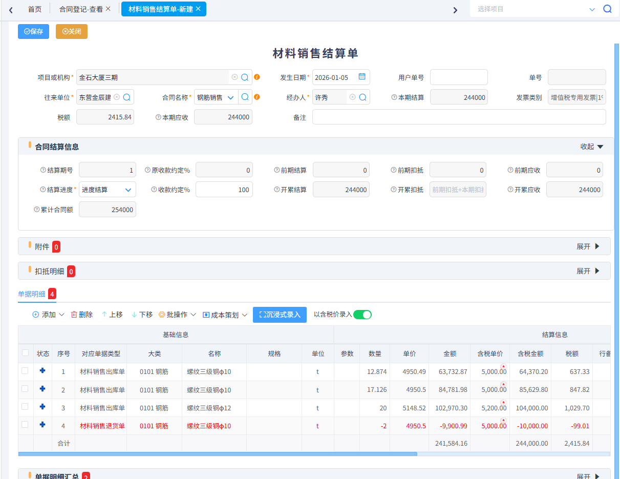 針對系統集成、市政路橋等行業有銷售業務可以填寫銷售合同,根據銷售合同生成材料銷售出庫單、材料銷售結算單。
