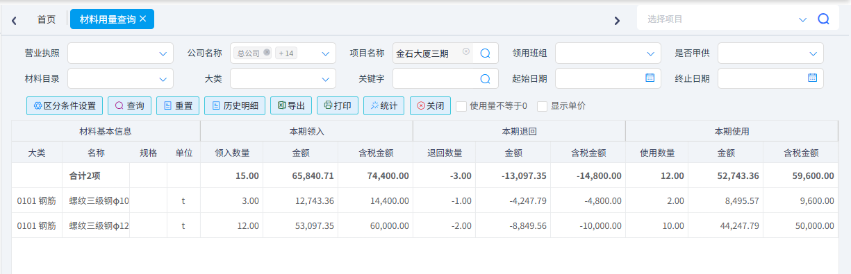 是用于查詢工地材料用量。可以按照營業(yè)執(zhí)照、公司、項目、班組、材料名稱、時間等篩選材料用量信息