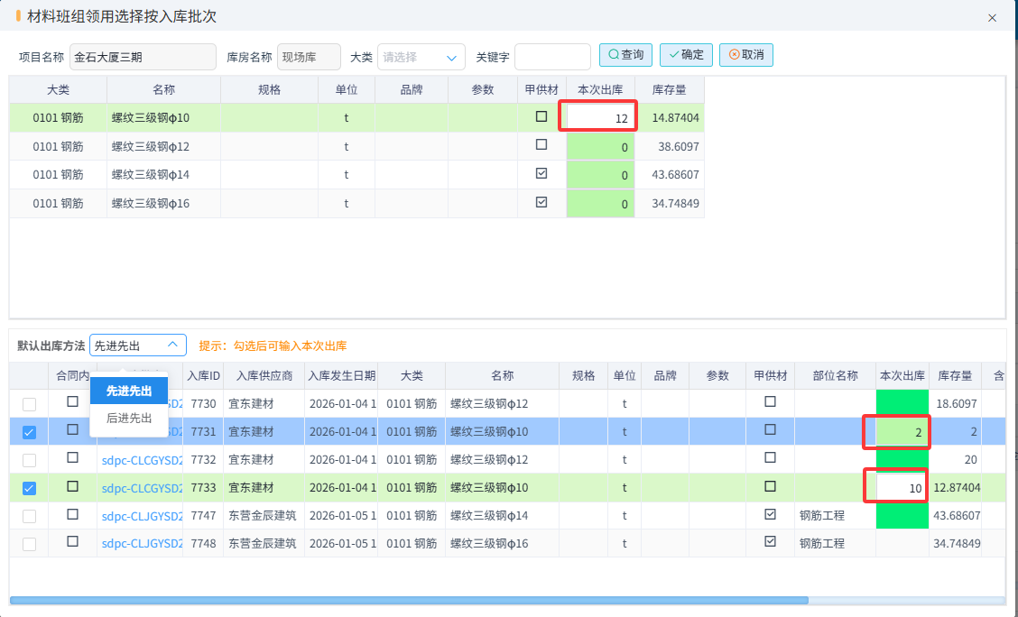 供應商送貨完成填寫材料采購驗收單,可以選擇直進項目和采購入庫。如果選擇采購入庫就自動進入庫存。項目上領用材料可以填寫材料領用申請單