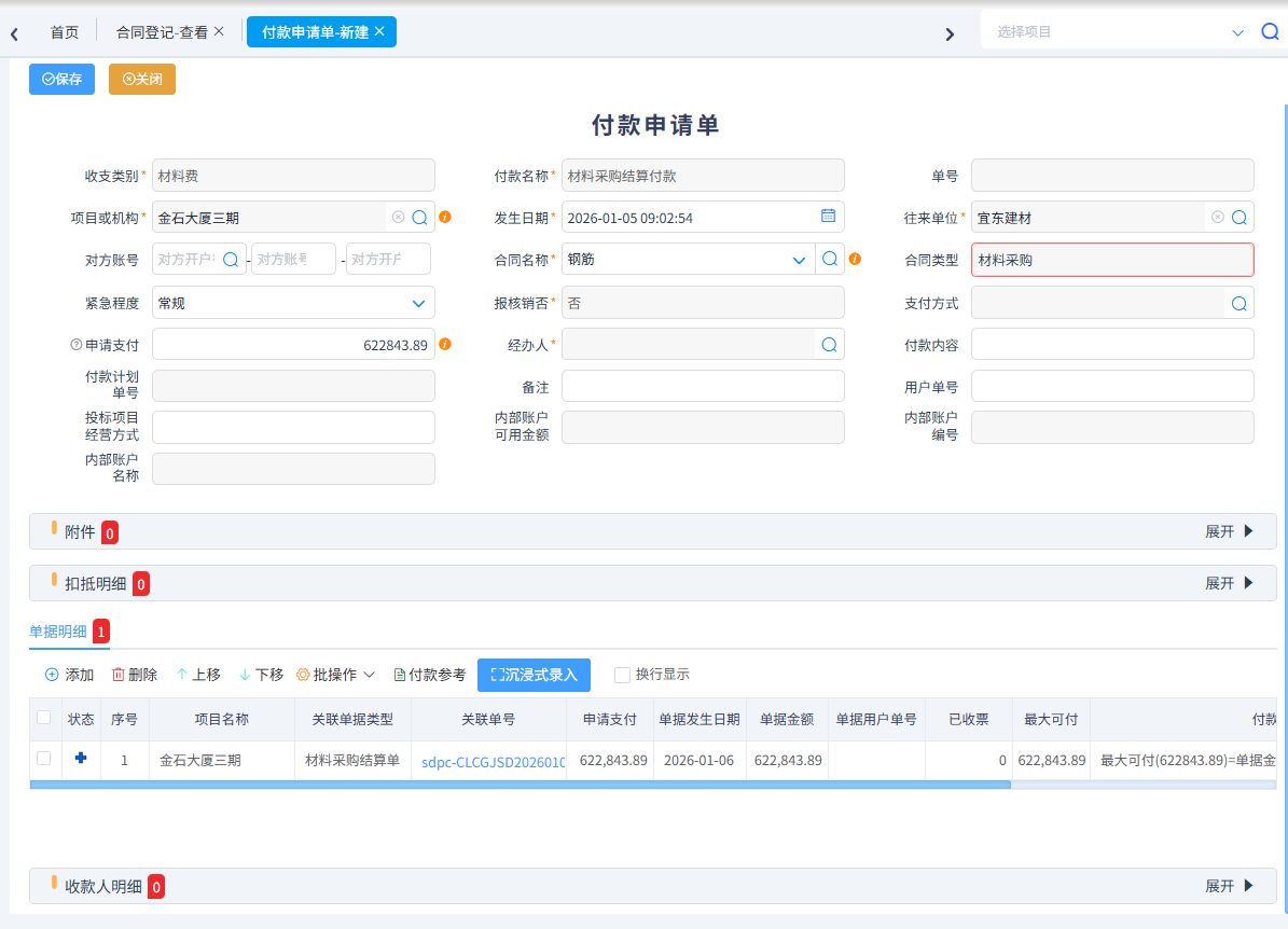 我們以生成合同為例,在合同里可以操作合同變更、材料到貨驗收、材料退貨、材料結算、合同扣款、合同預付款、合同結算付款、合同收進發票。