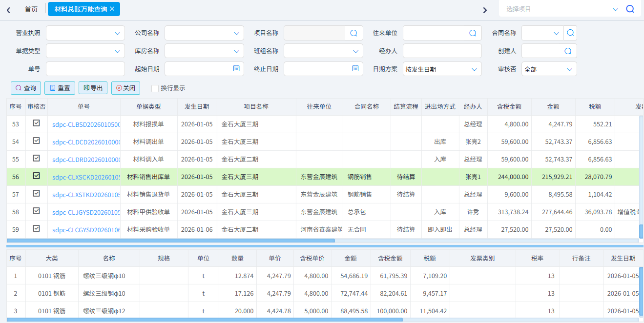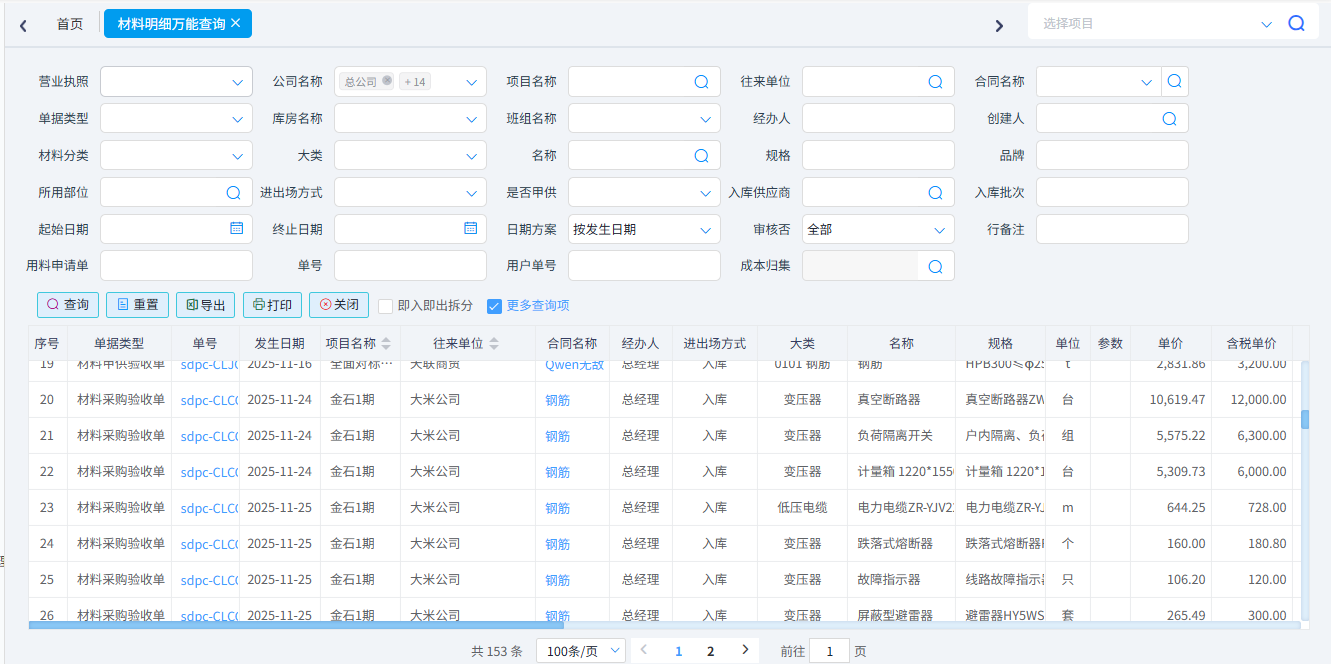 查詢所有類型的材料單據。一般用于材料單據的對賬。可以按照單據類型、項目名稱、供應商、材料名稱、時間等條件進行篩選。可以導出excel表格。