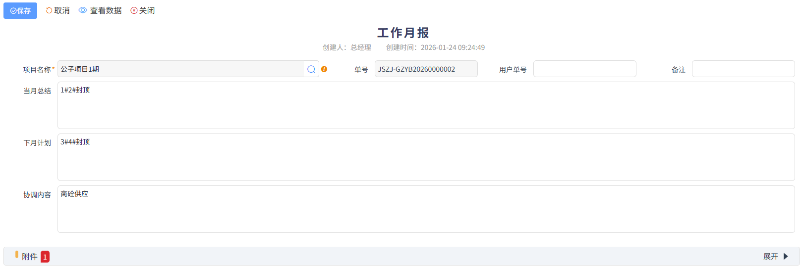 工作月報體現當月總結、下月計劃和協同內容三項,如下圖所示: