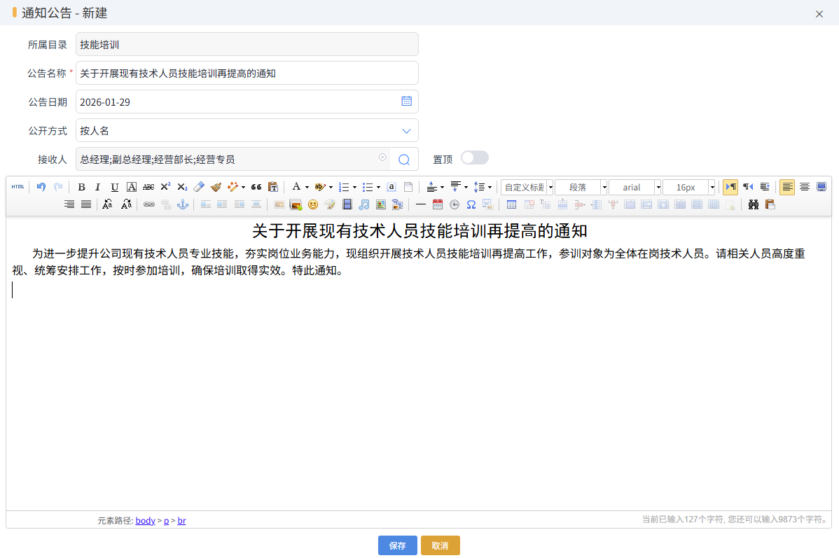 新建公司新聞,輸入新聞標題,置頂與否,下方的是新聞內容,根據需要調整段落格式,字體等,如下圖所示: