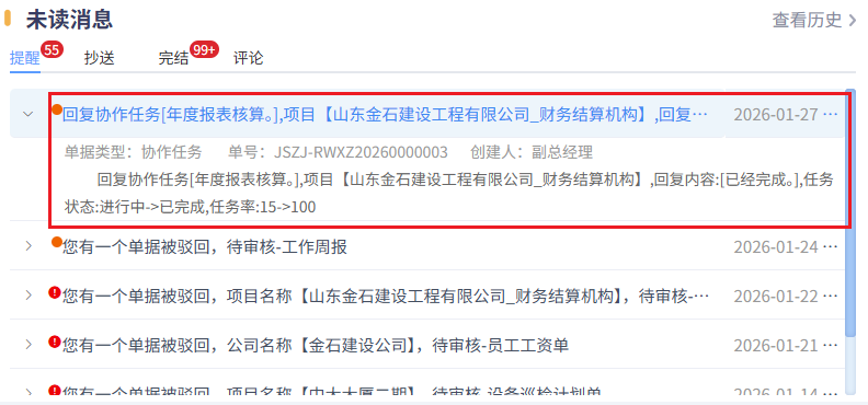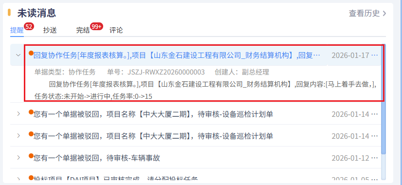 保存后,任務發起人會收到任務完成的消息提醒。如下圖所示: