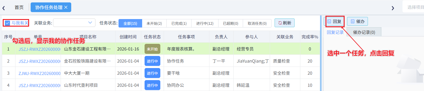例如,負責人點開查看任務后,在協作任務處理中,對當前任務進行回復,如下圖所示: