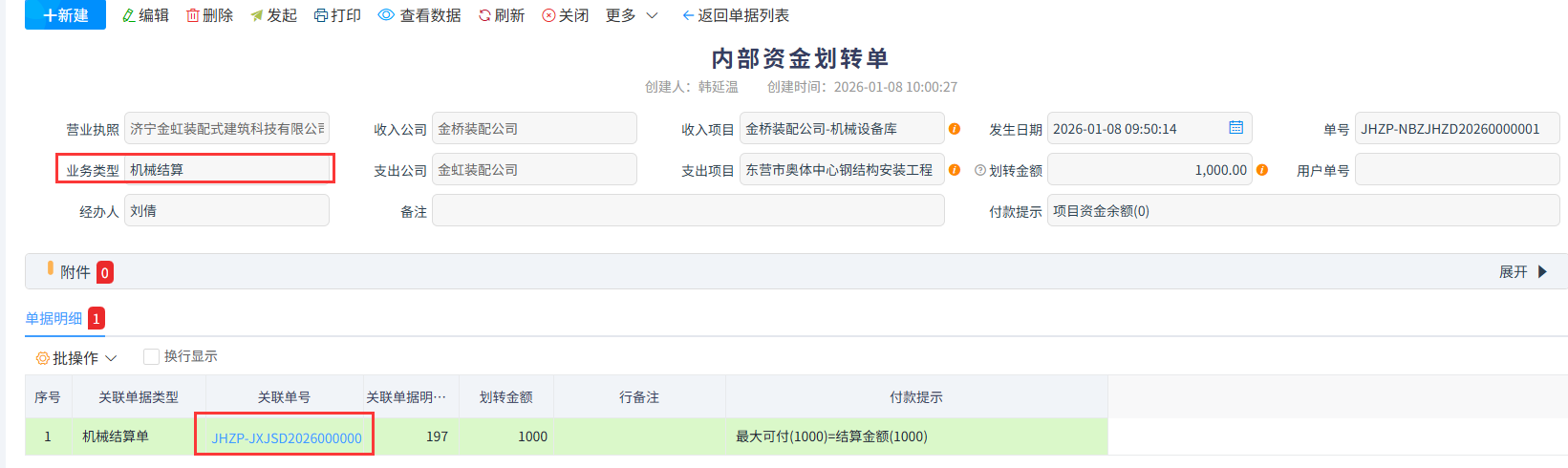 大部分內部業務是先有內部結算(如【機械結算單】、【周轉材結算單】、【費用分攤】、【材料調撥】、【工資分攤】、【項目補繳稅金】、【內部借款】、【內部還款】、【內部利息】)再以內部結算進行企業內部資金劃轉,每筆結算和劃轉必須是相同一個“營業執照”內不同機構或項目之間的內部往來,可規范內部資金流轉,確保資金調撥有跡可循、審批合規便于財務部門統一核算、對賬和資金管控。