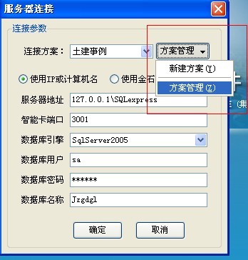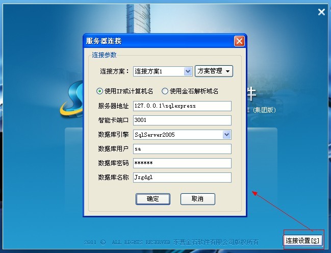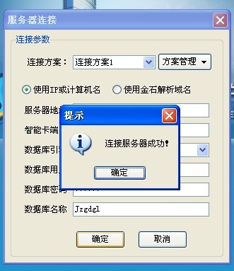 在彈出的窗口中填寫好:服務器ip地址、智能卡端口、數據引擎、數據庫用戶、數據庫密碼、數據庫名稱。
