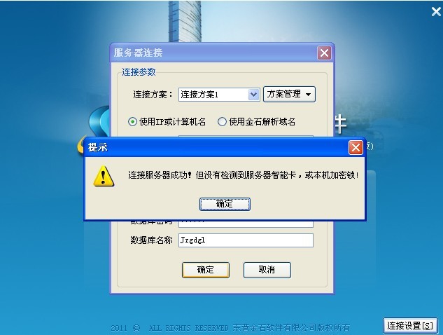 試用版或加密鎖沒插好,則會提示連接服務器成功!但沒有檢測到服務器智能卡,或本機機密鎖