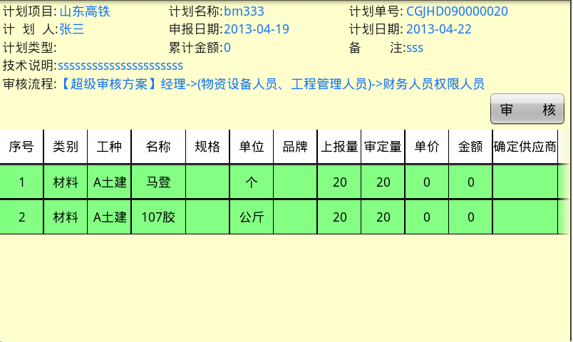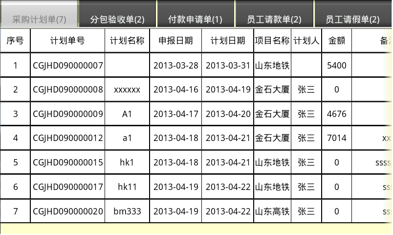 6. 審核中心(包括:采購計劃單審核、分包驗收單審核、付款申請單審核、員工請款單審核、員工請假單審核)
