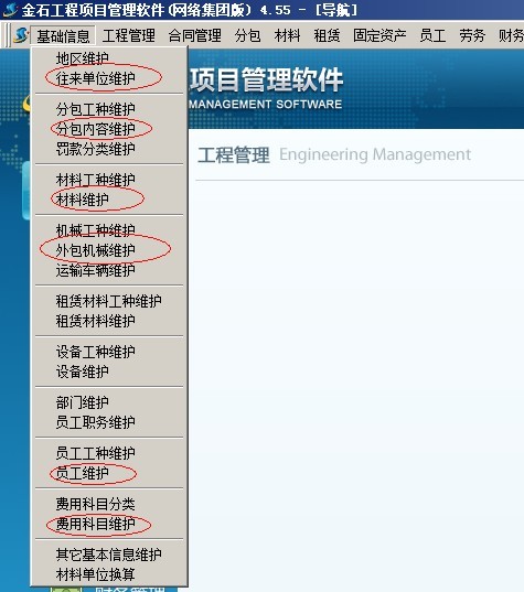 比較常用的是往來單位維護、分包內容維護、材料維護、外包機械維護、員工維護、費用科目維護。