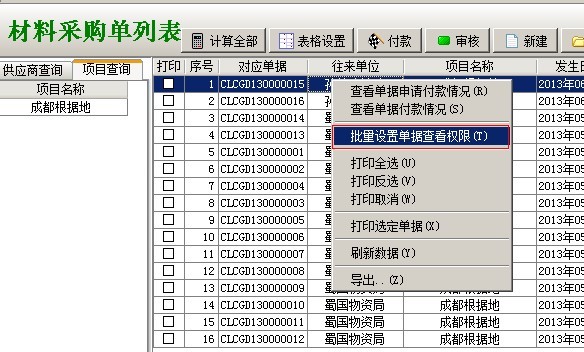 在工程項目管理軟件(集團版)中,存在一些設置(開關),使業務單據的訪問存在一定限制,只有在滿足條件的。用戶才能查看到該業務單據。如下圖: