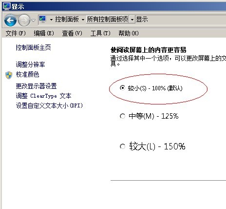 3. 在彈出的顯示窗口中選擇【較小S 100%(默認(rèn))】根據(jù)提示重啟系統(tǒng)后,界面就會(huì)顯示正常。