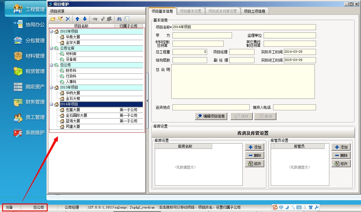 2、 建立用戶劉備 為總公司 直接 項目授權 ,再登陸看下效果 首先建立劉備為總公司人員,擁有所有的項目權限,如下圖所示