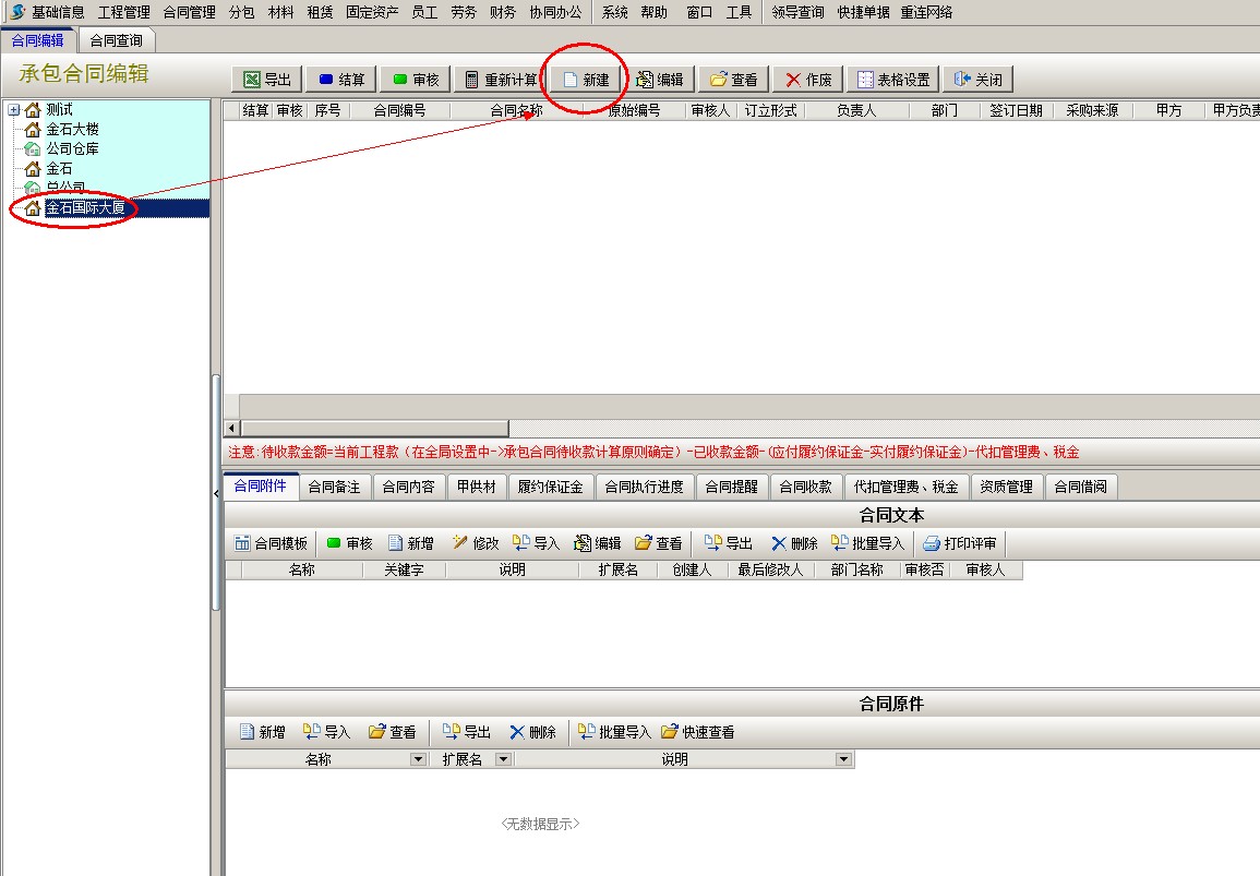 左邊選中新建的項目名稱金石國際大廈,右邊點擊新建,彈出新建承包合同窗口,錄入合同基本信息,填寫合同履約保證金金額,然后保存。